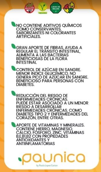 Sin gluten, lácteos, azúcar, colorantes, conservantes, soja, levaduras y aditivos químicos.